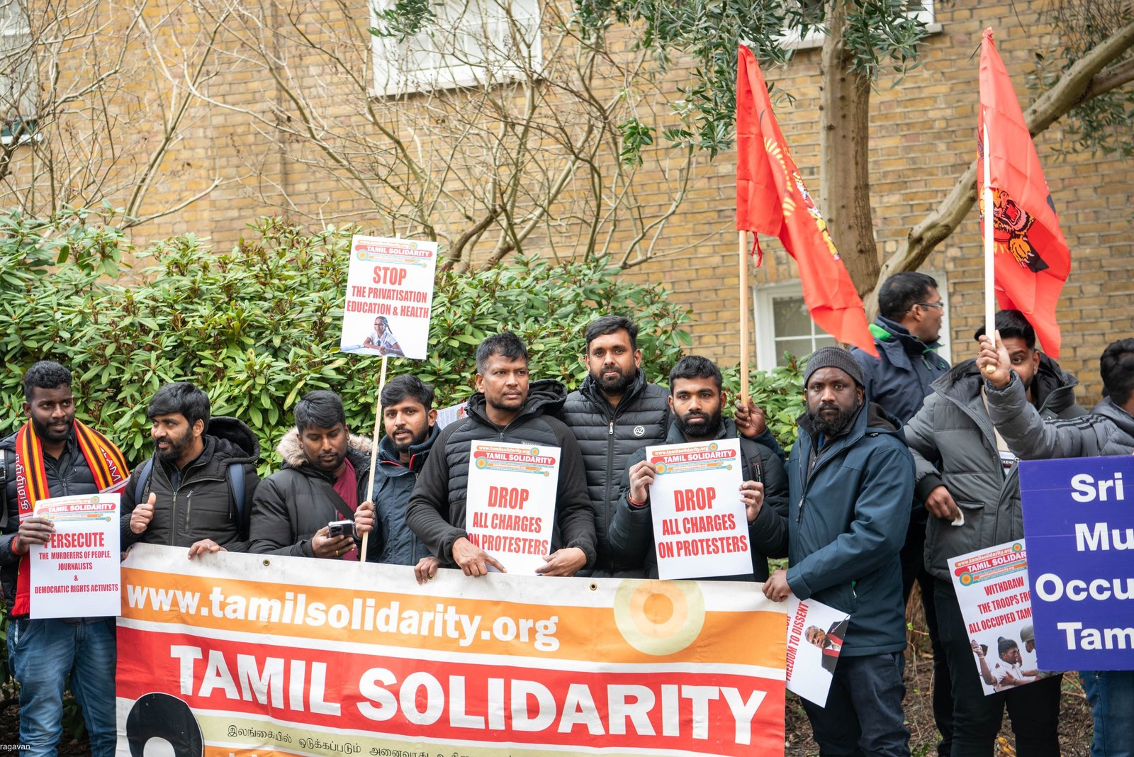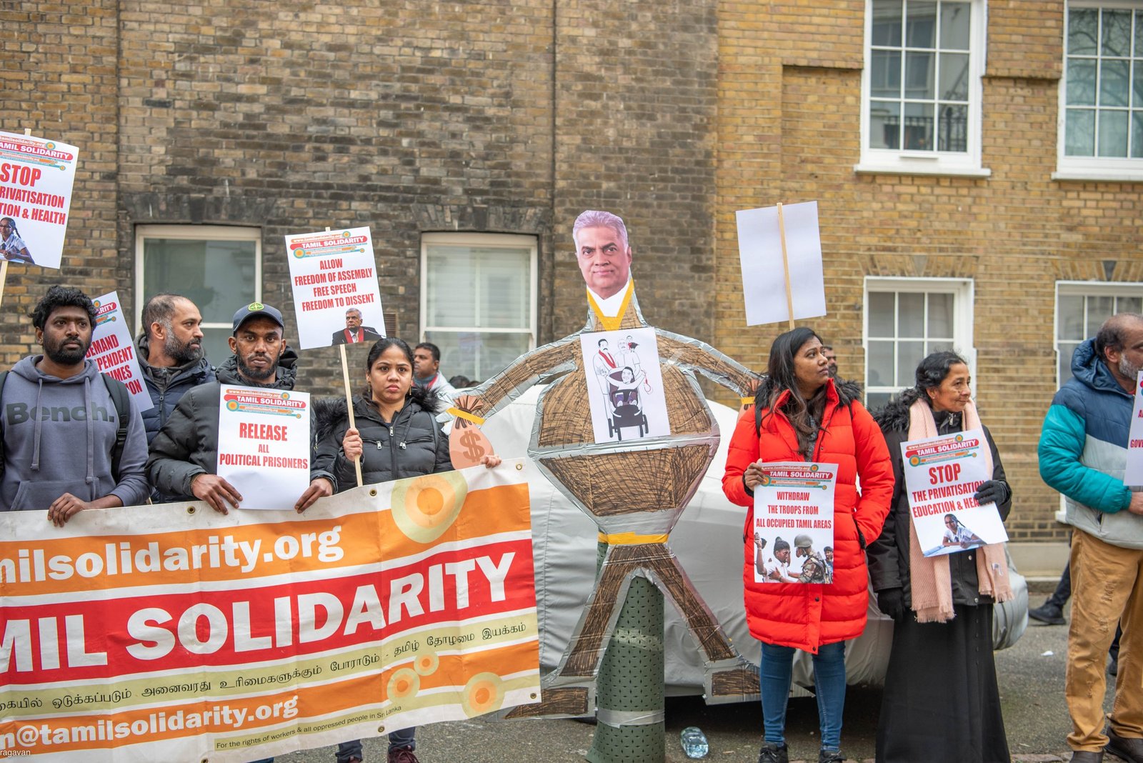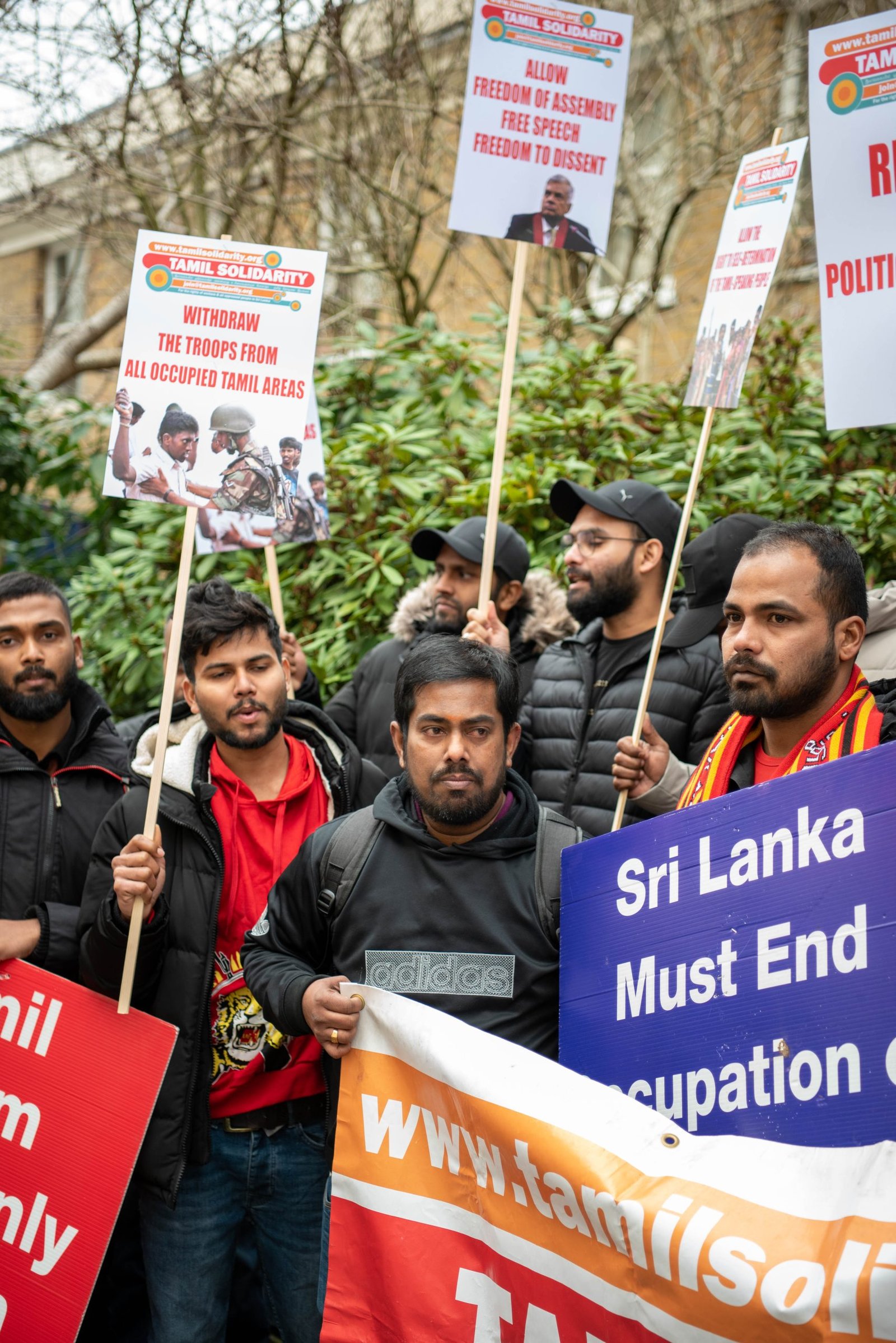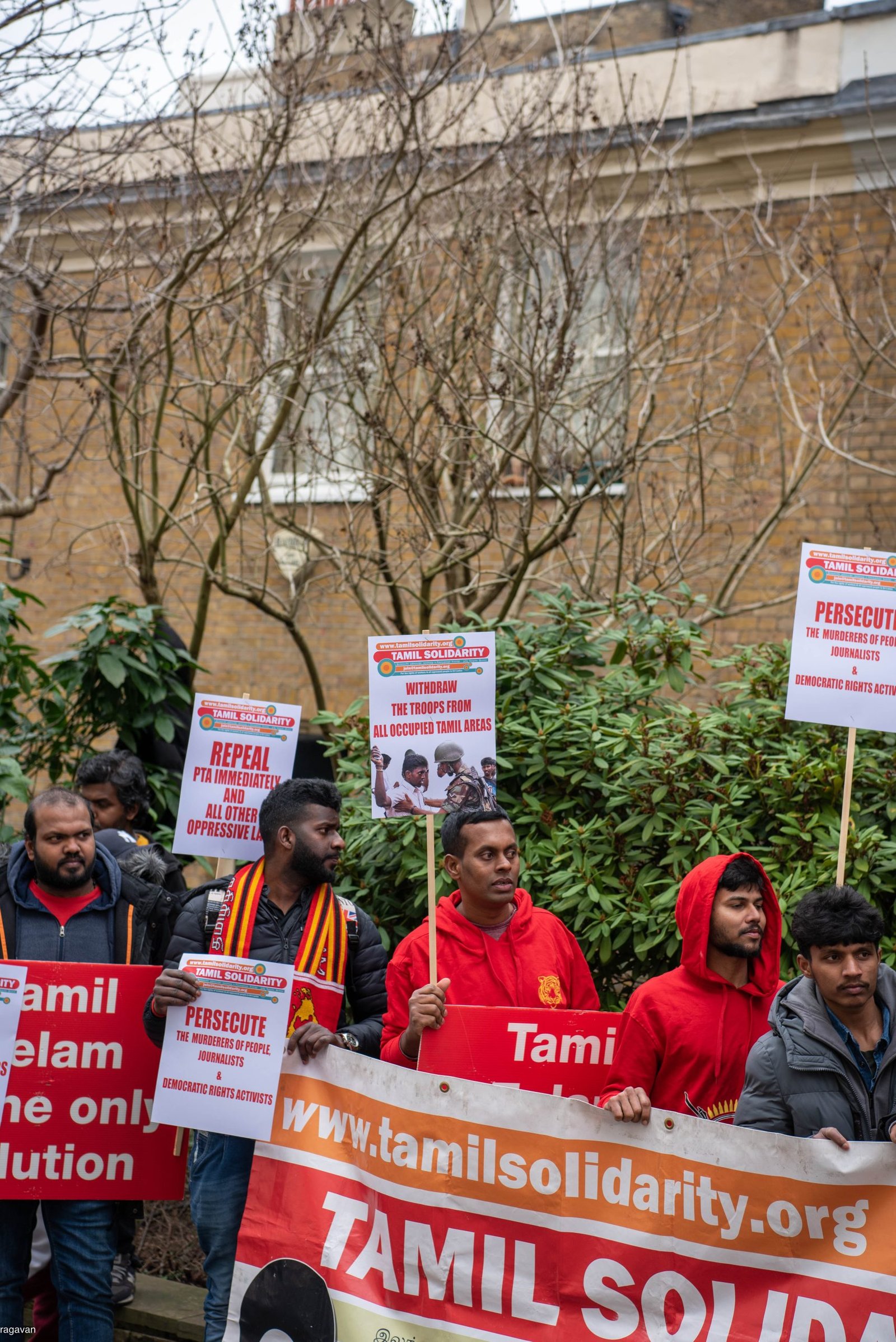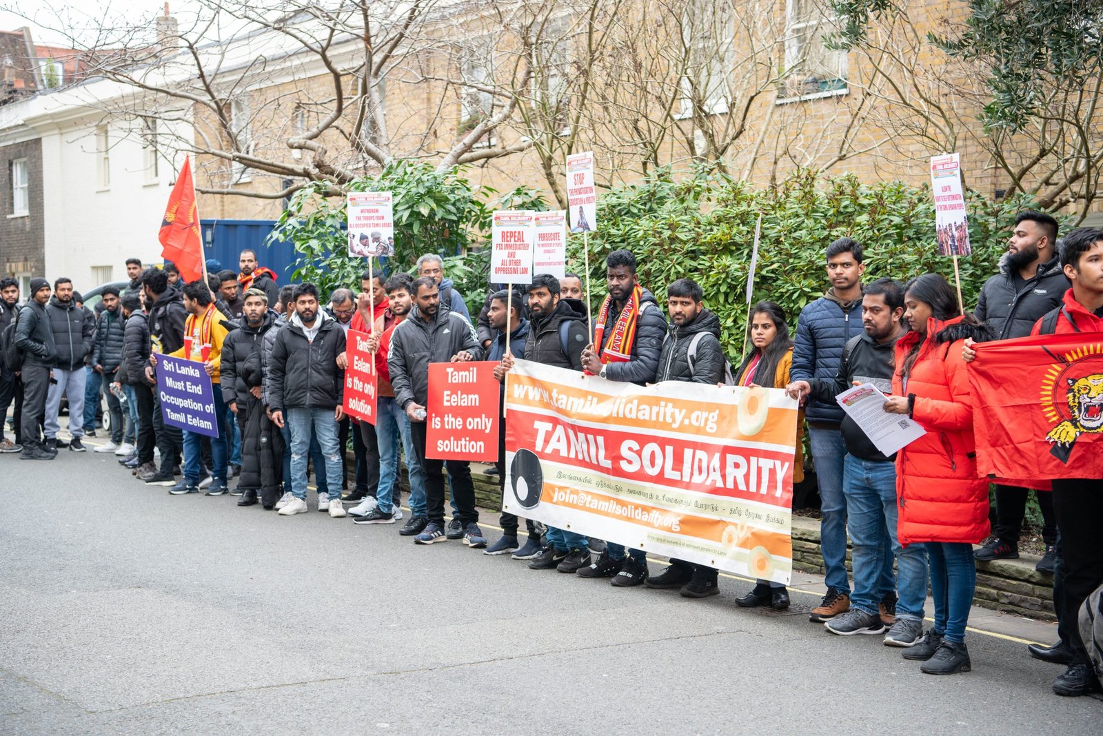 இலங்கையின் 75வது சுதந்திர தினமான பெப்ரவரி 4 அன்று, இலங்கையின் அடக்குமுறை ஆட்சியை எதிர்த்து, லண்டனில் உள்ள இலங்கை உயர்ஸ்தானிகராலயத்தில் தமிழ் சொலிடாரிட்டி போராட்டம் ஒன்றை ஏற்பாடு செய்தது. இந்த குளிர் காலநிலையில் 400க்கும் மேற்பட்டோர் போராட்டத்தில் ஈடுபட்டனர். ஏனைய புலம்பெயர் அமைப்புகளும் வெவ்வேறு நேரங்களில் போராட்டத்தை ஏற்பாடு செய்திருந்தன. 75 ஆண்டுகால அடக்குமுறை என்ற முழக்கத்துடன் இந்தப் போராட்டம் நடத்தப்பட்டது. எங்களின் ஒற்றுமை பொது மக்களுடன்தான் – அரசு மற்றும் உயரடுக்குடன் அல்ல, எமது சுதந்திரத்திற்கான போராட்டம் தொடர்கிறது, நாங்கள் எங்கள் விடுதலையை கோருகிறோம். ‘அரசியல் கைதிகளை விடுதலை செய், போராட்டம் நடத்தும் உரிமை பாதுகாக்கபடவேன்டும், சுயநிர்ணய உரிமை எமது உரிமை , ரணில் ராஜபக்ச வெளியேறு’ என மக்கள் கோஷமிட்டனர். “வெட்க்கம் இலங்கையில் மக்கள் பட்டினியால் சாகின்றார்கள் நீங்கள் ஆடம்பரமாக போலி சுதந்திரத்தை கொன்டாடுகின்றீர்கள்” உயர் ஸ்தானிகராலயத்தை நோக்கி அனைவரும் கோஷமிட்ட போது, எதிர்ப்பை திசைதிருப்பும் வகையில் மிகவும் சத்தமாக சிங்கள மொழியில் பாடல்களை சத்தமாக தூதரகத்தில் இருந்து ஒலிபரப்பட்டது வாசித்தனர். இது போராட்டக்கரர்களை கோபமடைய வைத்தது. தங்கள் கோபத்தை அவர்களிடம் காட்ட விரும்பினார், மேலும் அனைவரும் சேர்ந்து மிகவும் சத்தமாக கோஷமிட்டனர்.