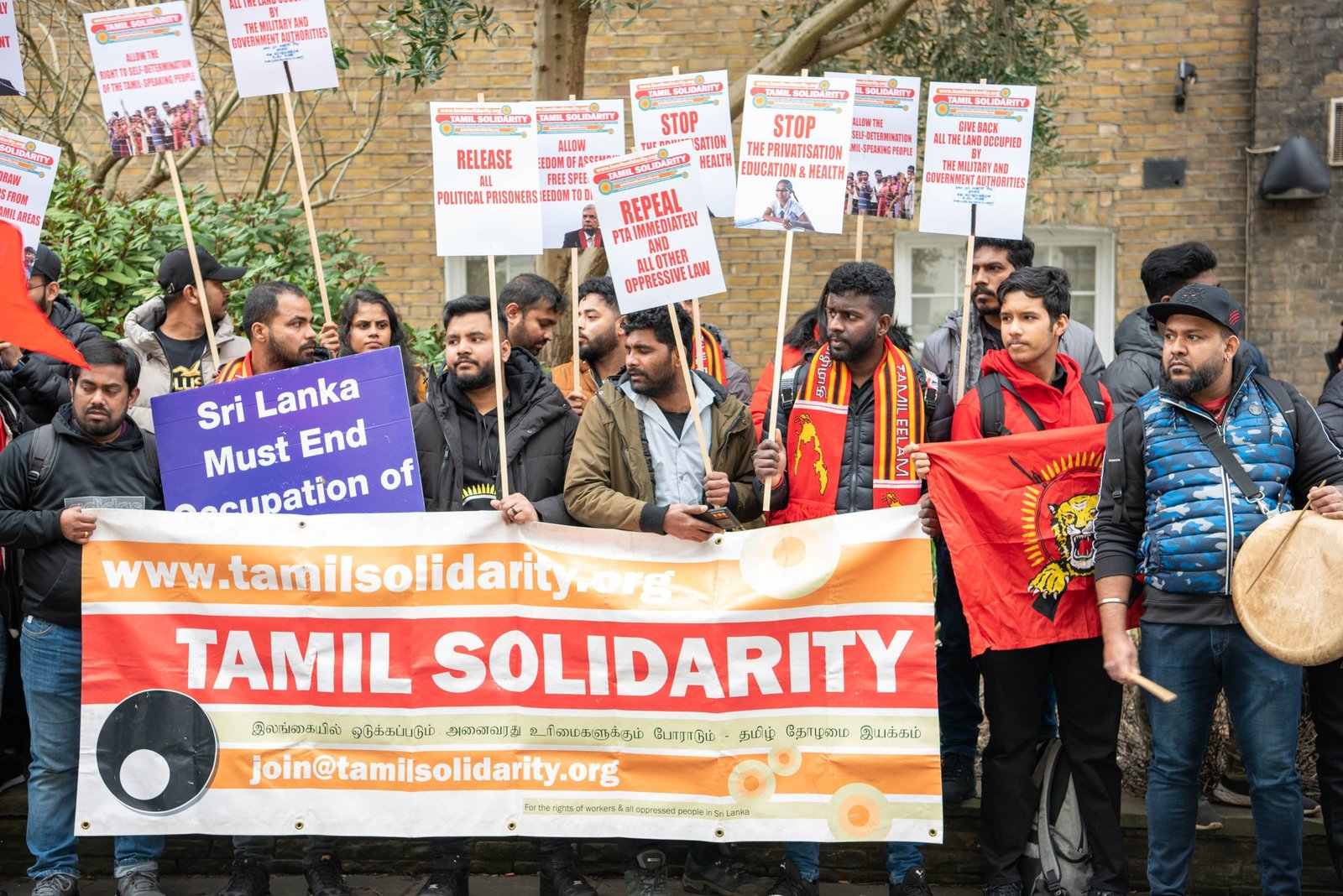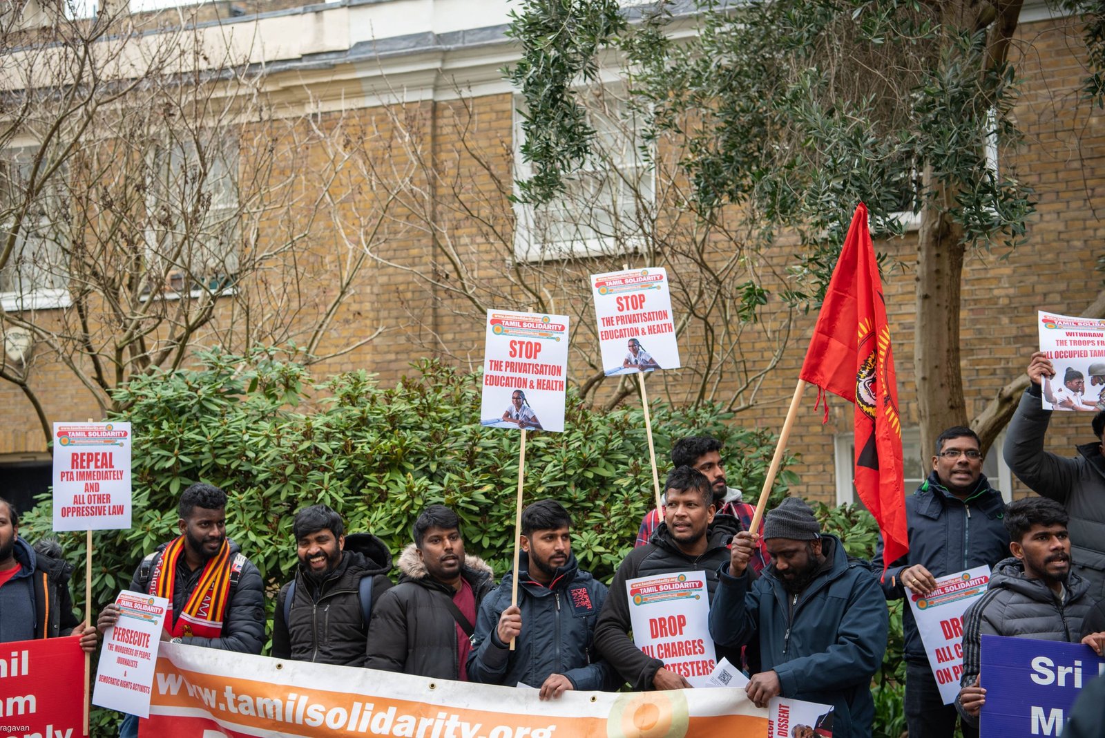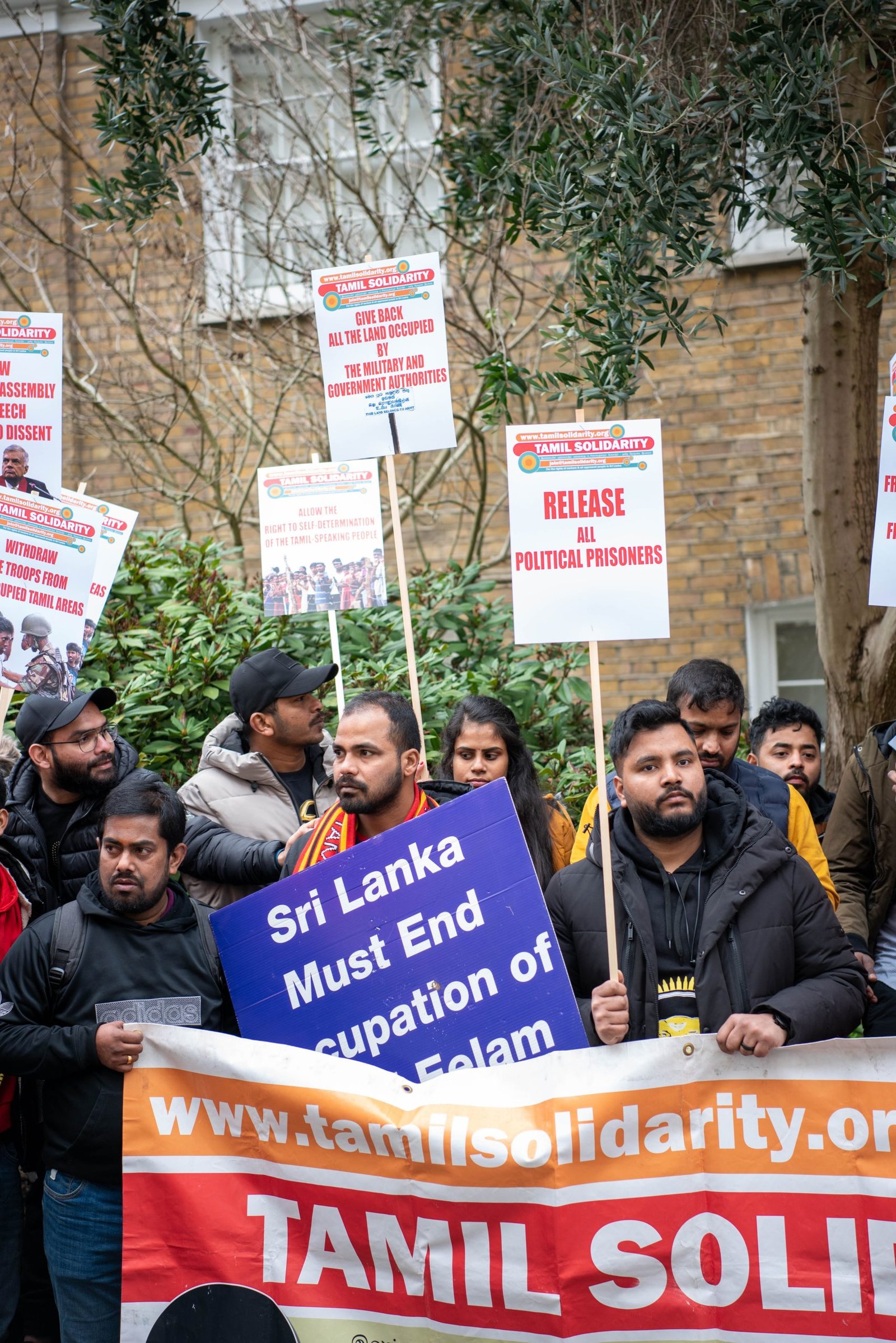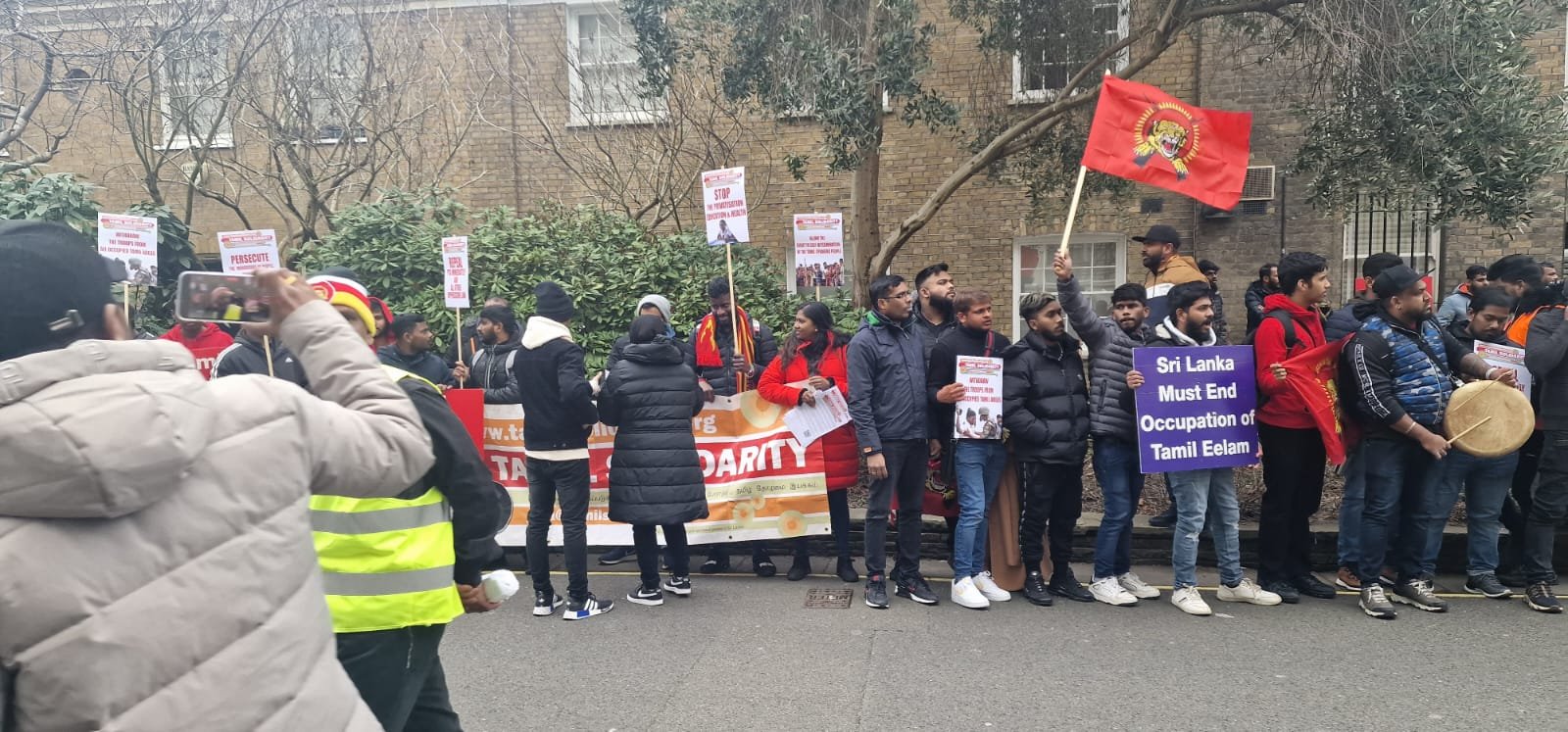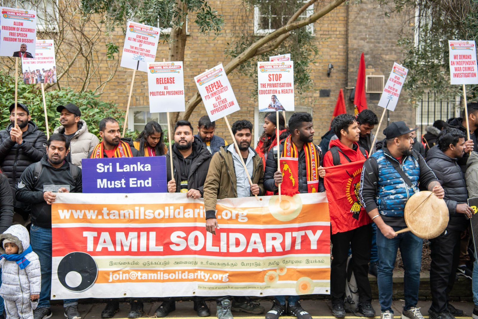 இலங்கையின் 75வது சுதந்திர தினமான பெப்ரவரி 4 அன்று, இலங்கையின் அடக்குமுறை ஆட்சியை எதிர்த்து, லண்டனில் உள்ள இலங்கை உயர்ஸ்தானிகராலயத்தில் தமிழ் சொலிடாரிட்டி போராட்டம் ஒன்றை ஏற்பாடு செய்தது. இந்த குளிர் காலநிலையில் 400க்கும் மேற்பட்டோர் போராட்டத்தில் ஈடுபட்டனர். ஏனைய புலம்பெயர் அமைப்புகளும் வெவ்வேறு நேரங்களில் போராட்டத்தை ஏற்பாடு செய்திருந்தன. 75 ஆண்டுகால அடக்குமுறை என்ற முழக்கத்துடன் இந்தப் போராட்டம் நடத்தப்பட்டது. எங்களின் ஒற்றுமை பொது மக்களுடன்தான் – அரசு மற்றும் உயரடுக்குடன் அல்ல, எமது சுதந்திரத்திற்கான போராட்டம் தொடர்கிறது, நாங்கள் எங்கள் விடுதலையை கோருகிறோம். ‘அரசியல் கைதிகளை விடுதலை செய், போராட்டம் நடத்தும் உரிமை பாதுகாக்கபடவேன்டும், சுயநிர்ணய உரிமை எமது உரிமை , ரணில் ராஜபக்ச வெளியேறு’ என மக்கள் கோஷமிட்டனர். “வெட்க்கம் இலங்கையில் மக்கள் பட்டினியால் சாகின்றார்கள் நீங்கள் ஆடம்பரமாக போலி சுதந்திரத்தை கொன்டாடுகின்றீர்கள்” உயர் ஸ்தானிகராலயத்தை நோக்கி அனைவரும் கோஷமிட்ட போது, எதிர்ப்பை திசைதிருப்பும் வகையில் மிகவும் சத்தமாக சிங்கள மொழியில் பாடல்களை சத்தமாக தூதரகத்தில் இருந்து ஒலிபரப்பட்டது வாசித்தனர். இது போராட்டக்கரர்களை கோபமடைய வைத்தது. தங்கள் கோபத்தை அவர்களிடம் காட்ட விரும்பினார், மேலும் அனைவரும் சேர்ந்து மிகவும் சத்தமாக கோஷமிட்டனர்.