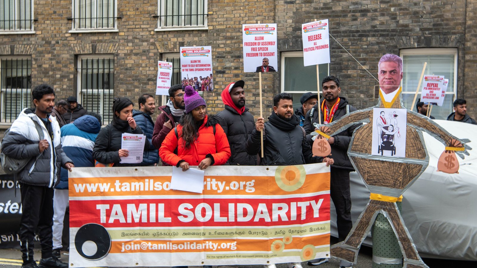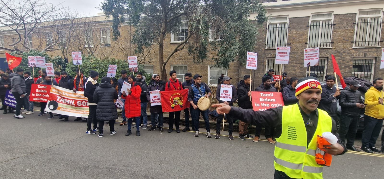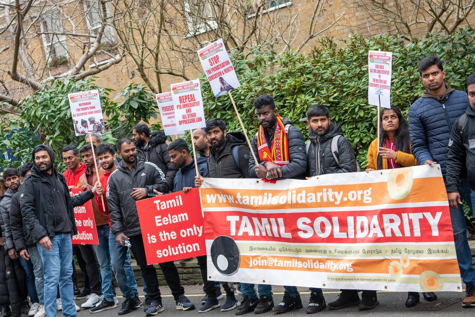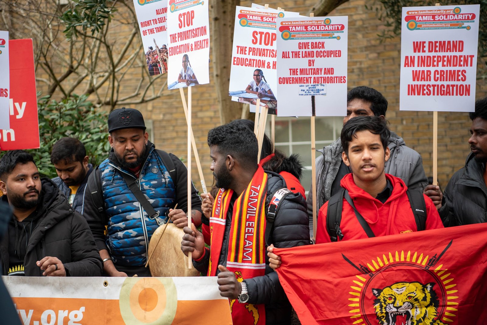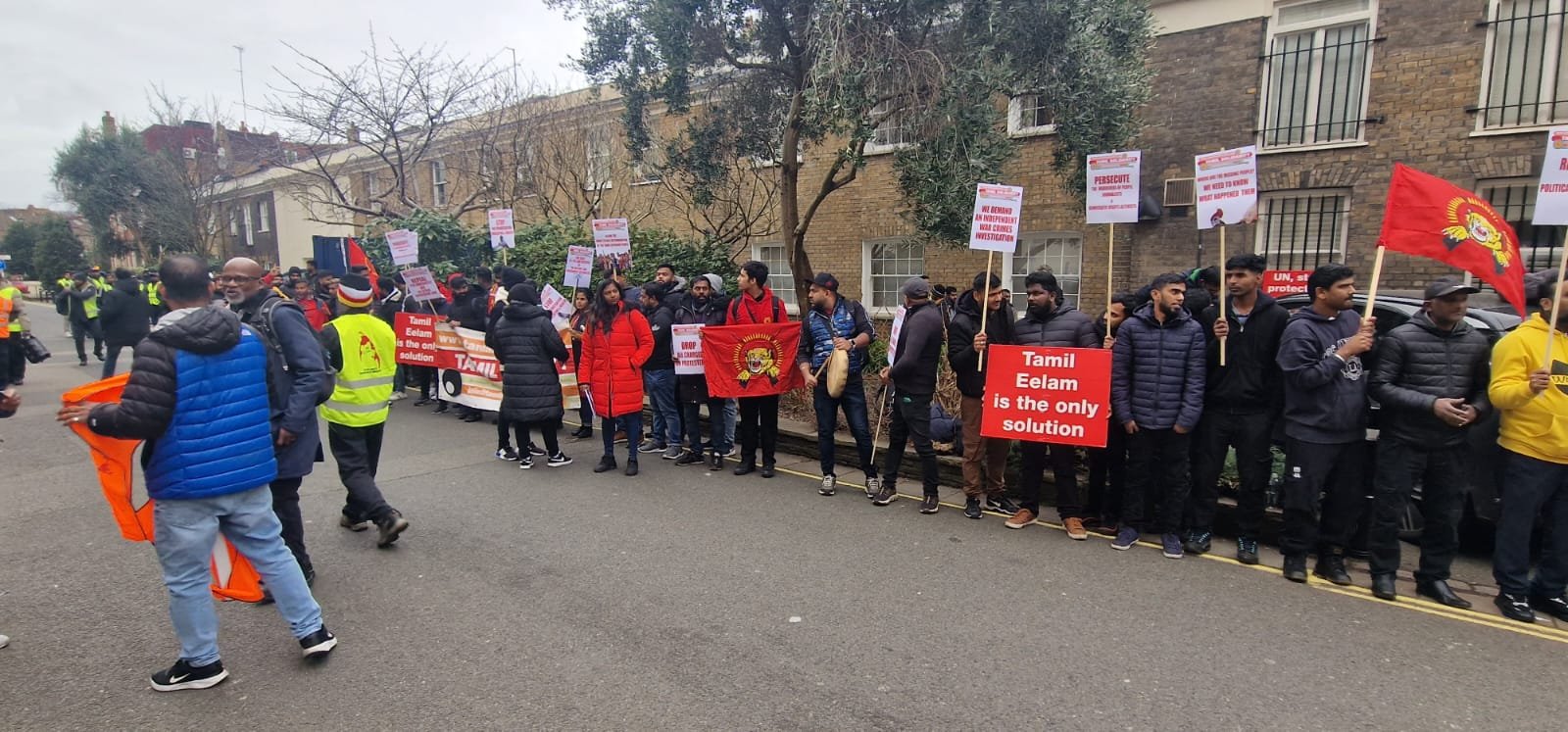 இலங்கையின் 75வது சுதந்திர தினமான பெப்ரவரி 4 அன்று, இலங்கையின் அடக்குமுறை ஆட்சியை எதிர்த்து, லண்டனில் உள்ள இலங்கை உயர்ஸ்தானிகராலயத்தில் தமிழ் சொலிடாரிட்டி போராட்டம் ஒன்றை ஏற்பாடு செய்தது. இந்த குளிர் காலநிலையில் 400க்கும் மேற்பட்டோர் போராட்டத்தில் ஈடுபட்டனர். ஏனைய புலம்பெயர் அமைப்புகளும் வெவ்வேறு நேரங்களில் போராட்டத்தை ஏற்பாடு செய்திருந்தன. 75 ஆண்டுகால அடக்குமுறை என்ற முழக்கத்துடன் இந்தப் போராட்டம் நடத்தப்பட்டது. எங்களின் ஒற்றுமை பொது மக்களுடன்தான் – அரசு மற்றும் உயரடுக்குடன் அல்ல, எமது சுதந்திரத்திற்கான போராட்டம் தொடர்கிறது, நாங்கள் எங்கள் விடுதலையை கோருகிறோம். ‘அரசியல் கைதிகளை விடுதலை செய், போராட்டம் நடத்தும் உரிமை பாதுகாக்கபடவேன்டும், சுயநிர்ணய உரிமை எமது உரிமை , ரணில் ராஜபக்ச வெளியேறு’ என மக்கள் கோஷமிட்டனர். “வெட்க்கம் இலங்கையில் மக்கள் பட்டினியால் சாகின்றார்கள் நீங்கள் ஆடம்பரமாக போலி சுதந்திரத்தை கொன்டாடுகின்றீர்கள்” உயர் ஸ்தானிகராலயத்தை நோக்கி அனைவரும் கோஷமிட்ட போது, எதிர்ப்பை திசைதிருப்பும் வகையில் மிகவும் சத்தமாக சிங்கள மொழியில் பாடல்களை சத்தமாக தூதரகத்தில் இருந்து ஒலிபரப்பட்டது வாசித்தனர். இது போராட்டக்கரர்களை கோபமடைய வைத்தது. தங்கள் கோபத்தை அவர்களிடம் காட்ட விரும்பினார், மேலும் அனைவரும் சேர்ந்து மிகவும் சத்தமாக கோஷமிட்டனர்.